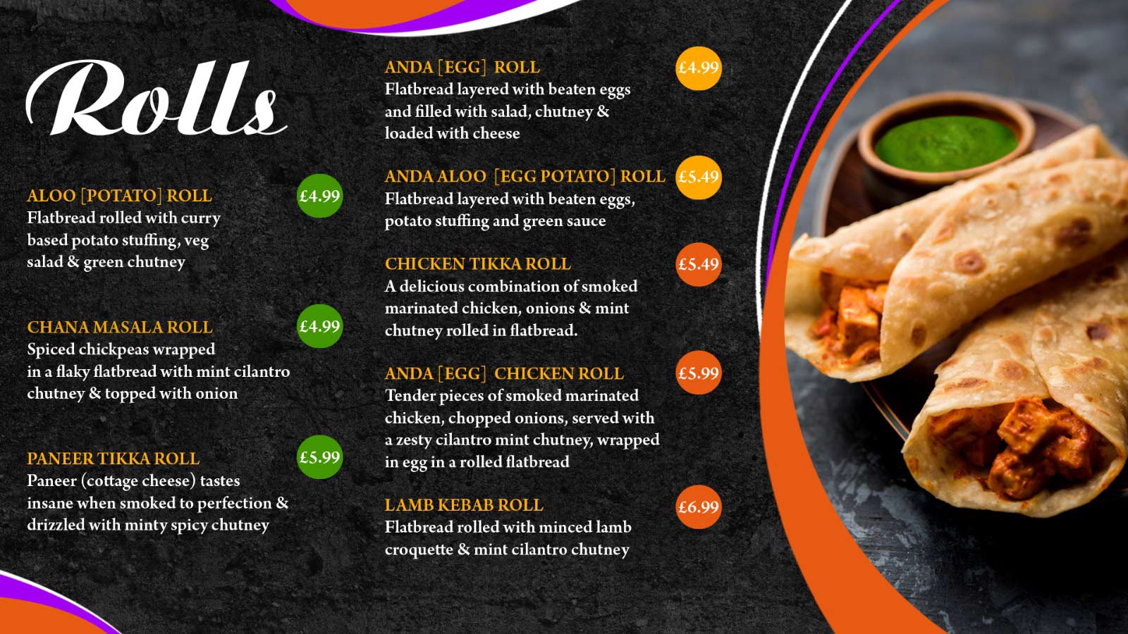 A delicious combination of smoked marinated chicken, onions & mint chutney rolled in flatbread.